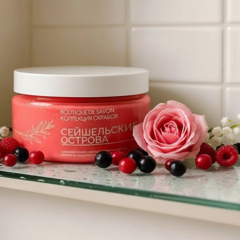 Подарите своей коже ягодную нежность! Этот кремовый скраб с чувственным и соблазнительным ароматом подарит вам моменты истинного удовольствия. Мягкие отшелушивающие частицы бережно удалят омертвевшие клетки, делая кожу шелковистой и сияющей, а сочетание ягодных, цветочных и мускусных нот создаст атмосферу романтики и тепла.