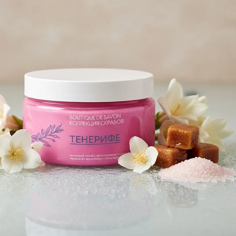 Почувствуйте дыхание весны на Тенерифе! Этот кремовый скраб с насыщенным цветочным ароматом подарит вашей коже нежность и сияние. Мягкие отшелушивающие частицы бережно удалят омертвевшие клетки, делая кожу идеально гладкой и шелковистой, а чувственный аромат жасмина, туберозы и квисквалиса наполнит вас энергией и вдохновением.
