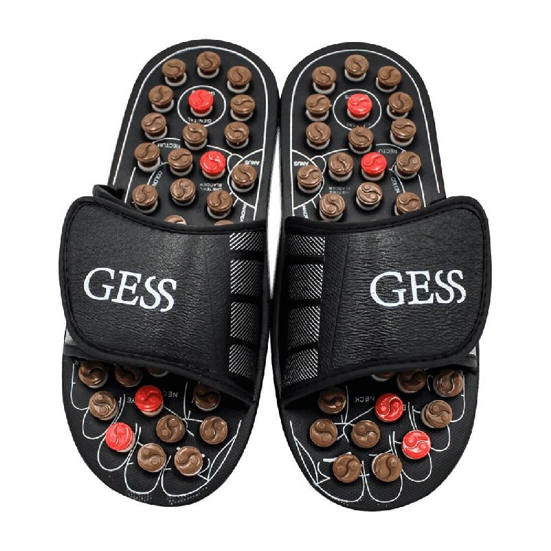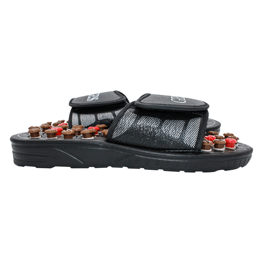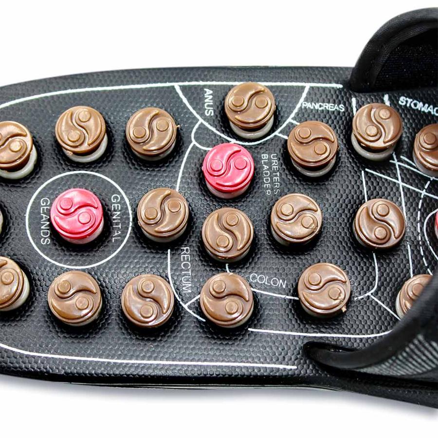 Массажер для стоп в виде тапочек для акупунктурного массажа стоп. Массаж осуществляется пружинящими кнопками, которые при надавливании проворачиваются и массируют определённую точку.