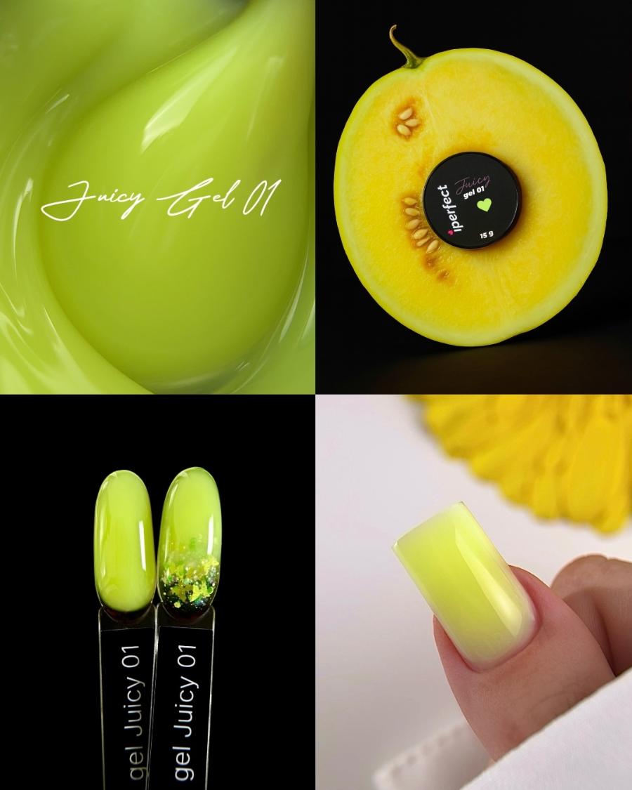 Коллекция Juicy Gel - это 3 ярких цвета + 2 эффекта. Неон, блёстки, бабочки! Сочные и заметные, как летние фрукты!