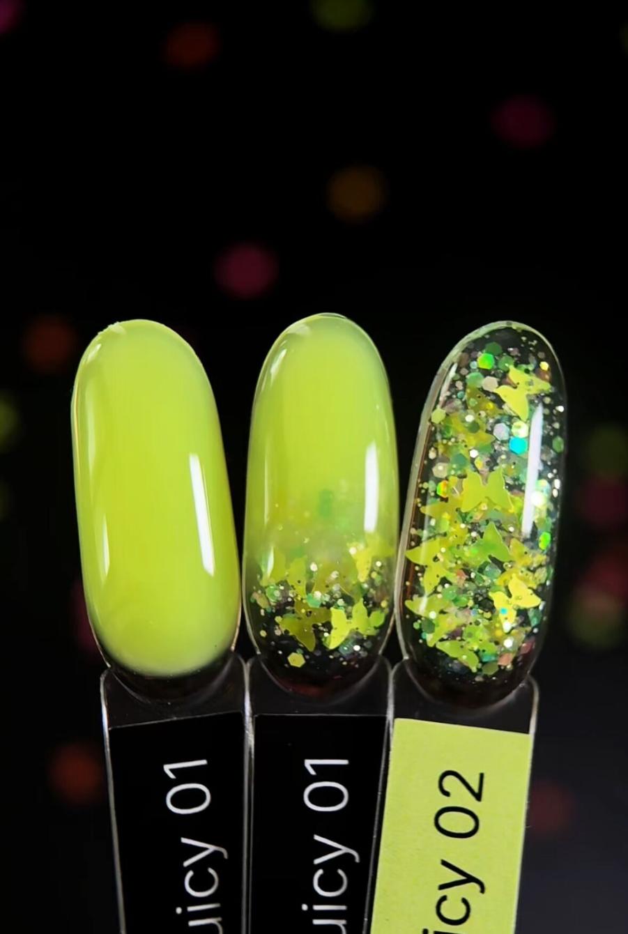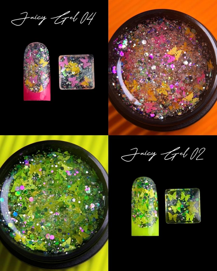 Коллекция Juicy Gel - это 3 ярких цвета + 2 эффекта. Неон, блёстки, бабочки! Сочные и заметные, как летние фрукты!