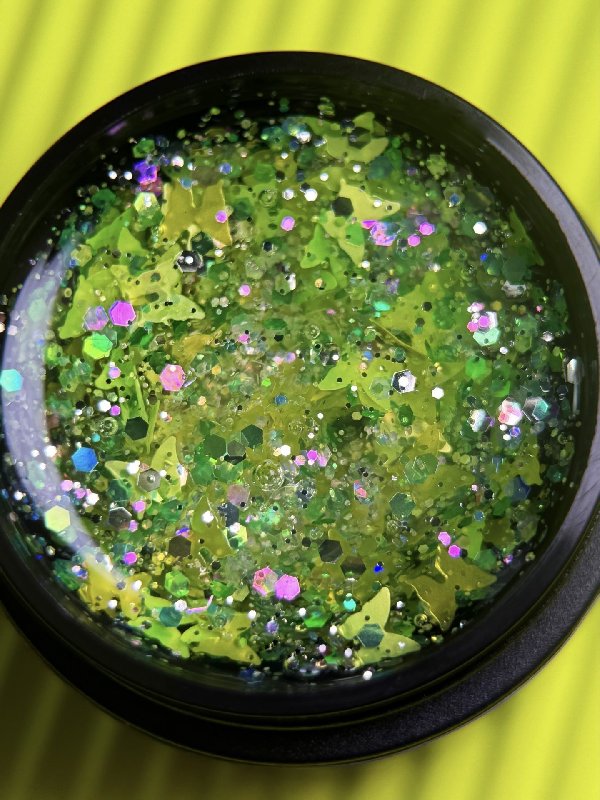 Juicy gel 02 прозрачная основа с салатовыми бабочками и шестигранниками