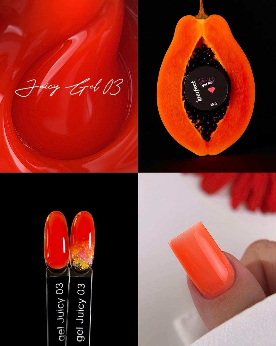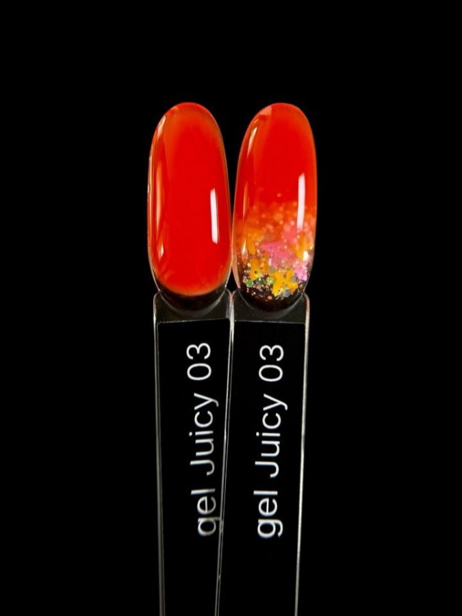 Коллекция Juicy Gel - это 3 ярких цвета + 2 эффекта. Неон, блёстки, бабочки! Сочные и заметные, как летние фрукты!
