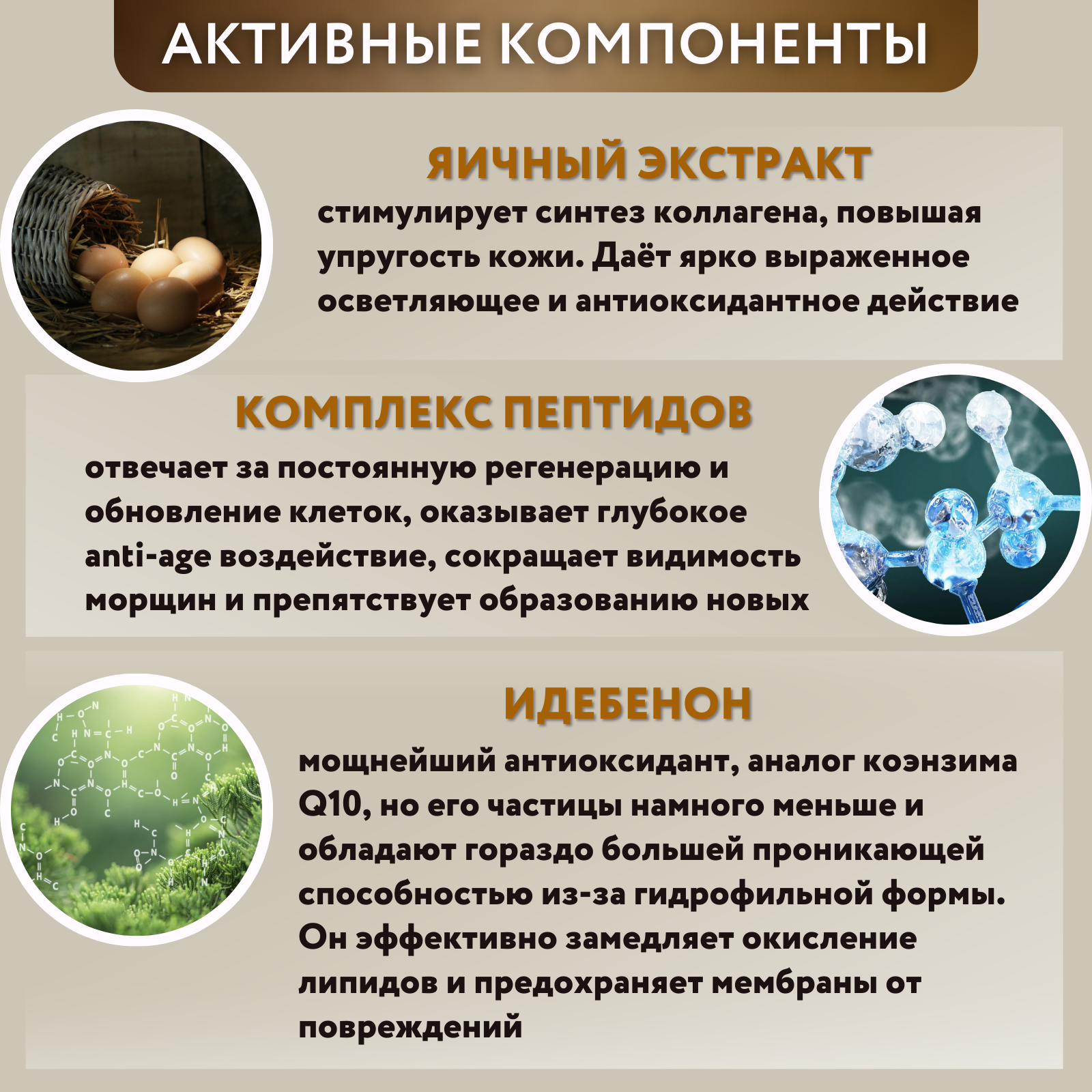 Состав: Water, Glycerin, PEG/PPG-17/6 Copolymer, Glycereth-26, Butylene Glycol, Phenoxyethanol, PEG-32, Carbomer, Hydroxyethyl Urea, Trehalose, Triethanolamine, Betaine, Allantoin, PEG-60 Hydrogenated Castor Oil, Ethylhexylglycerin, Sodium Polyacrylate, Disodium EDTA, Hydroxyethylcellulose, Albumen Extract (100PPM), Fragrance, 1,2-Hexanediol, Egg Yolk Extract (10PPM), Polyglyceryl-10 Oleate, Caprylic/Capric Triglyceride, Hydrogenated Lecithin, Ethoxydiglycol, Poloxamer 338, Sodium Hyaluronate, Disodium Phosphate, Polysorbate 60, Hydroxydecyl Ubiquinone (1,000PPB), Resveratrol, Sodium Phosphate, Potassium Hyaluronate, Hydrolyzed Sodium Hyaluronate, Saccharomyces Polypeptides, Ferulic Acid, Citric Acid, Glycine Max (Soybean) Polypeptide, Hyaluronic Acid, Capryl Hyaluronic Acid, Acetyl Tetrapeptide-5, Palmitoyl Oligopeptide,Palmitoyl Pentapeptide-4, Palmitoyl Tripeptide-5, Copper Tripeptide-1, Acetyl Hexapeptide-8, Palmitoyl Tetrapeptide-7.
