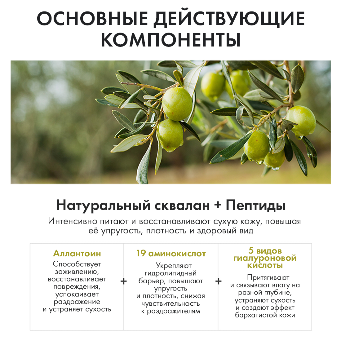 Комплекс (5 видов) гиалуроновых кислот обеспечивает долговременное и высокоинтенсивное увлажнение кожи, защищает от обезвоживания и образования преждевременных морщинок, стимулирует клеточное обновление, заживляет ранки и трещинки.