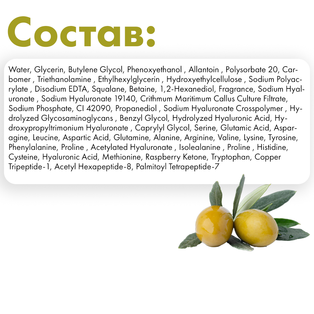 Состав: Water, Glycerin, Butylene Glycol, Phenoxyethanol , Allantoin , Polysorbate 20, Carbomer , Triethanolamine , Ethylhexylglycerin , Hydroxyethylcellulose , Sodium Polyacrylate , Disodium EDTA, Squalane, Betaine, 1,2-Hexanediol, Fragrance, Sodium Hyaluronate , Sodium Hyaluronate 19140, Crithmum Maritimum Callus Culture Filtrate, Sodium Phosphate, CI 42090, Propanediol , Sodium Hyaluronate Crosspolymer , Hydrolyzed Glycosaminoglycans , Benzyl Glycol, Hydrolyzed Hyaluronic Acid, Hydroxypropyltrimonium Hyaluronate , Caprylyl Glycol, Serine, Glutamic Acid, Asparagine, Leucine, Aspartic Acid, Glutamine, Alanine, Arginine, Valine, Lysine, Tyrosine, Phenylalanine, Proline , Acetylated Hyaluronate , Isolealanine , Proline , Histidine, Cysteine, Hyaluronic Acid, Methionine, Raspberry Ketone, Tryptophan, Copper Tripeptide-1, Acetyl Hexapeptide-8, Palmitoyl Tetrapeptide-7
