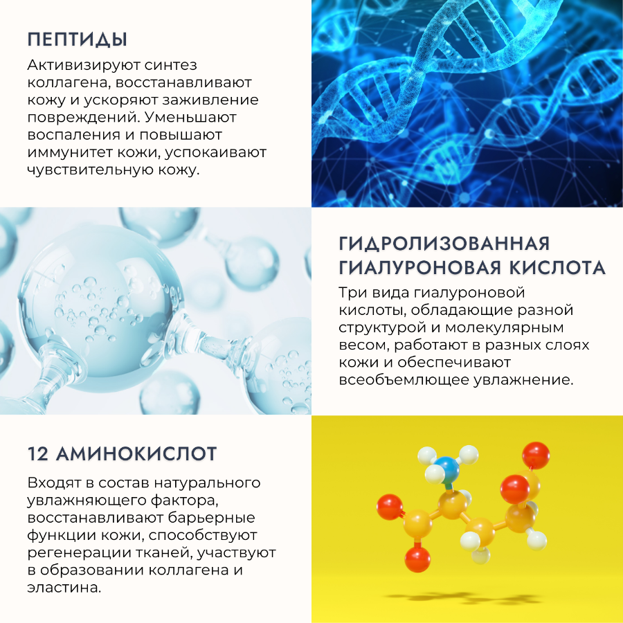 Комплекс из 12 видов аминокислот восстанавливает и укрепляет структуру кожи, укрепляет защитный барьер и замедляет процессы старения. Улучшает цвет кожи, придает здоровое сияние и упругость.